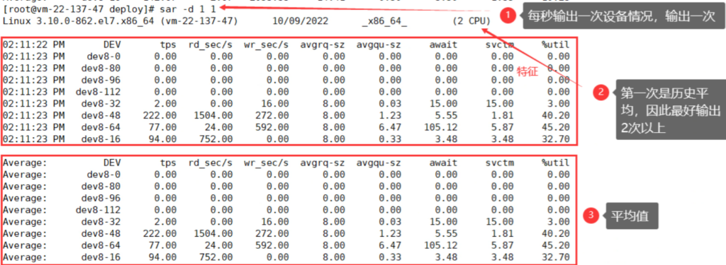 sar -d -f /var/log/sa/sa03 -p|grep -E “DEV|sd” : 从文件sa03中过滤出磁盘信息(sa03代表3号,最多保存一个月的日志)