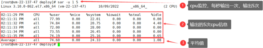 sar -u 1 10 : 间隔1s输出一次cpu使用情况,总共输出10次