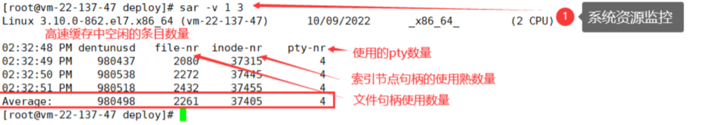 sar -v 1 3 : 监控目前系统中的资源使用情况