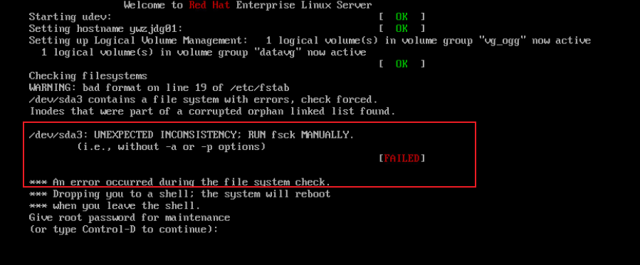 /dev/sda3:unexpected inconsistency;run fsck manually
