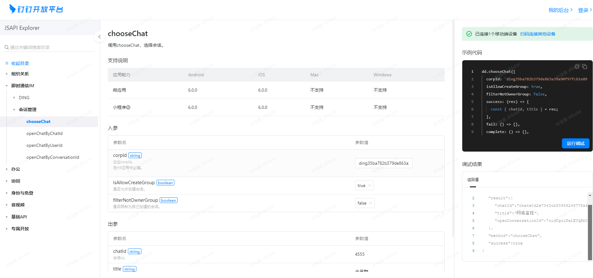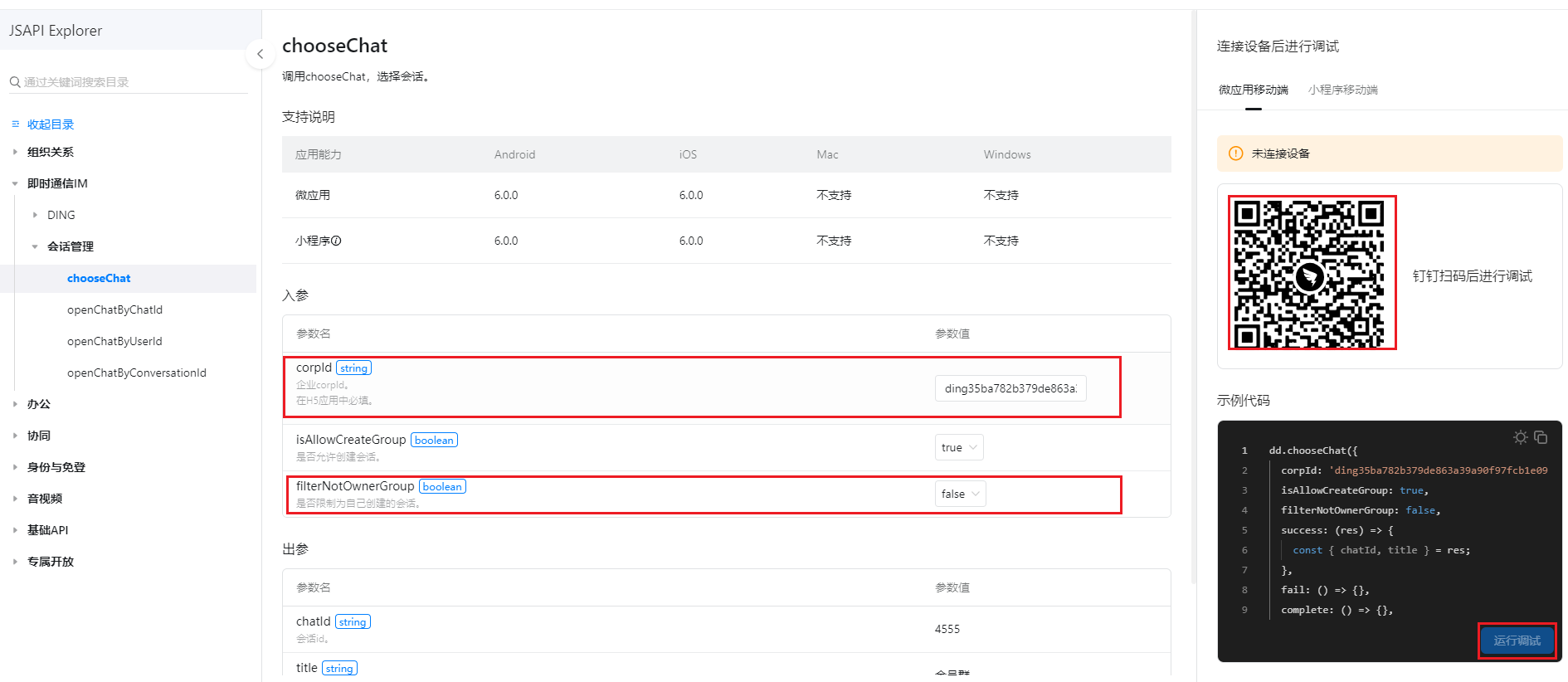 4.1、openConversationId的值需要填写企业corpId,并通过钉钉手机端扫描后,点击运行调试获取,扫描后手机端会跳群列表,选择指定群后openConversationId即可获取到对应值
