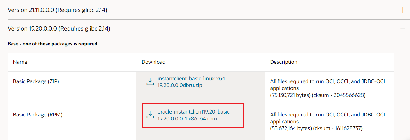 rpm -ivh oracle-instantclient19.20-basic-19.20.0.0.0-1.x86_64.rpm