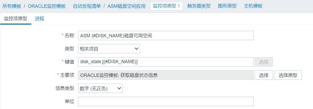 6、创建监控原型,类型选择相关项目,关联第4步创建的监控项,注意#DISK_NAME是大写,键值disK_state自己定义,后缀必须是[#DISK_NAME]