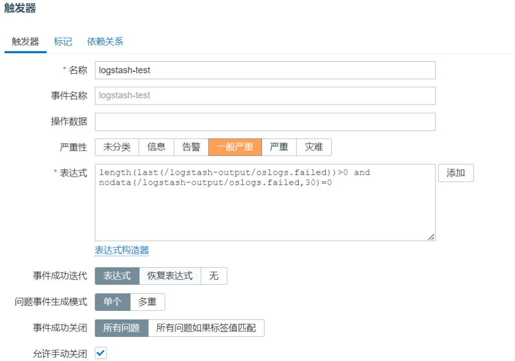 #配置yum仓库 cat << EOF | sudo tee /etc/yum.repos.d/elasticsearch.repo [elasticsearch-7.x] name=Elasticsearch repository for 7.x packages baseurl=https://artifacts.elastic.co/packages/7.x/yum gpgcheck=1 gpgkey=https://artifacts.elastic.co/GPG-KEY-elasticsearch enabled=1 autorefresh=1 type=rpm-md EOF #安装logstash sudo yum install logstash systemctl start logstash.service #安装插件logstash-output-zabbix cd /usr/share/logstash/bin/ ./logstash-plugin logstash-output-zabbix