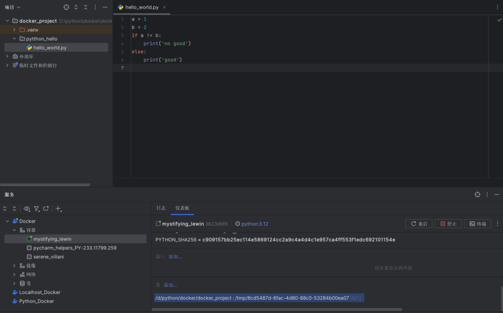 拉取完成后编写代码测试,程序会自动创建虚拟机,用虚拟机的环境运行本地的py脚本,该脚本是自动复制到虚拟机里面