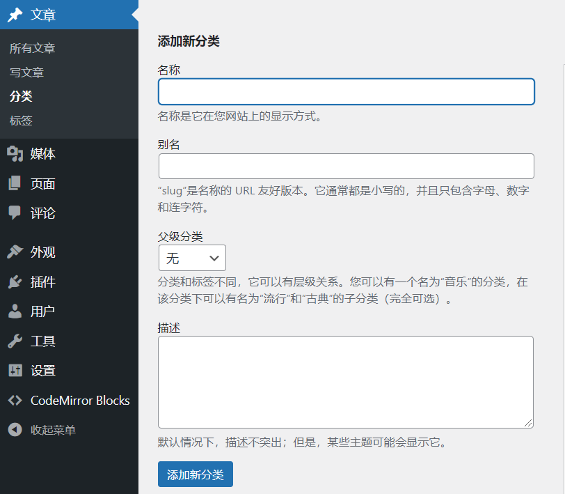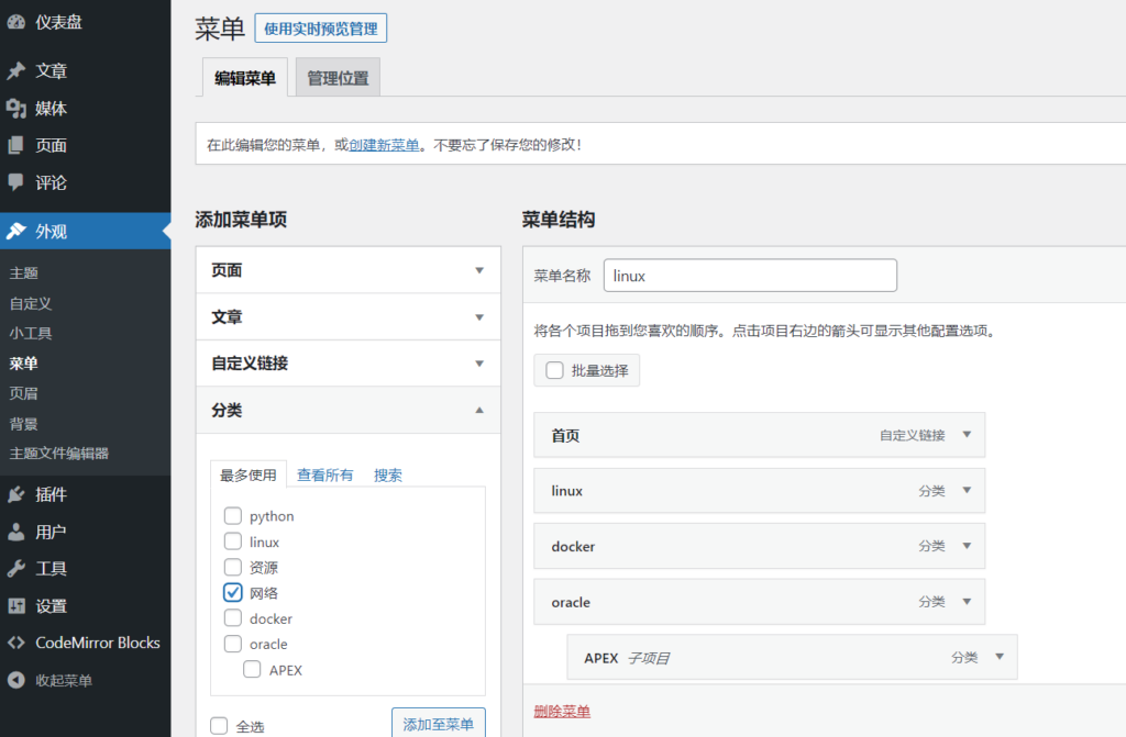 WordPress使用小结 On 2022年5月23日2022年12月24日By 去哪儿 1、添加分类 2、编辑菜单栏,将分类显示在菜单栏上 3、安装插件CodeMirror Blocks 4、去除页脚标识