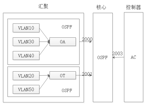 如下图所示,汇聚交换机划分两个VPN实例,OA和OT。OA实例分别应用到VLAN10、30、40、2000,其中VLAN30是作为所有AP设备的管理地址,VLAN40是无线用户地址,VLAN2000是作为和核心交换机的通讯主要接口。OT实例分别应用到VLAN20、50、2001,其中VLAN50是作为无线用户地址,VLAN2001是作为和核心交换机通讯的主要接口。核心交换机配置VLAN2000和2001对应汇聚的VPN实例。控制器配置2003,与核心通讯,实现无线AP管控。