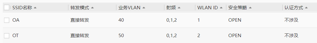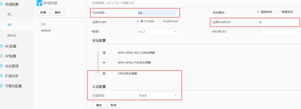 3.3、在OA组中配置SSID,命名OA和OT,采用免密认证