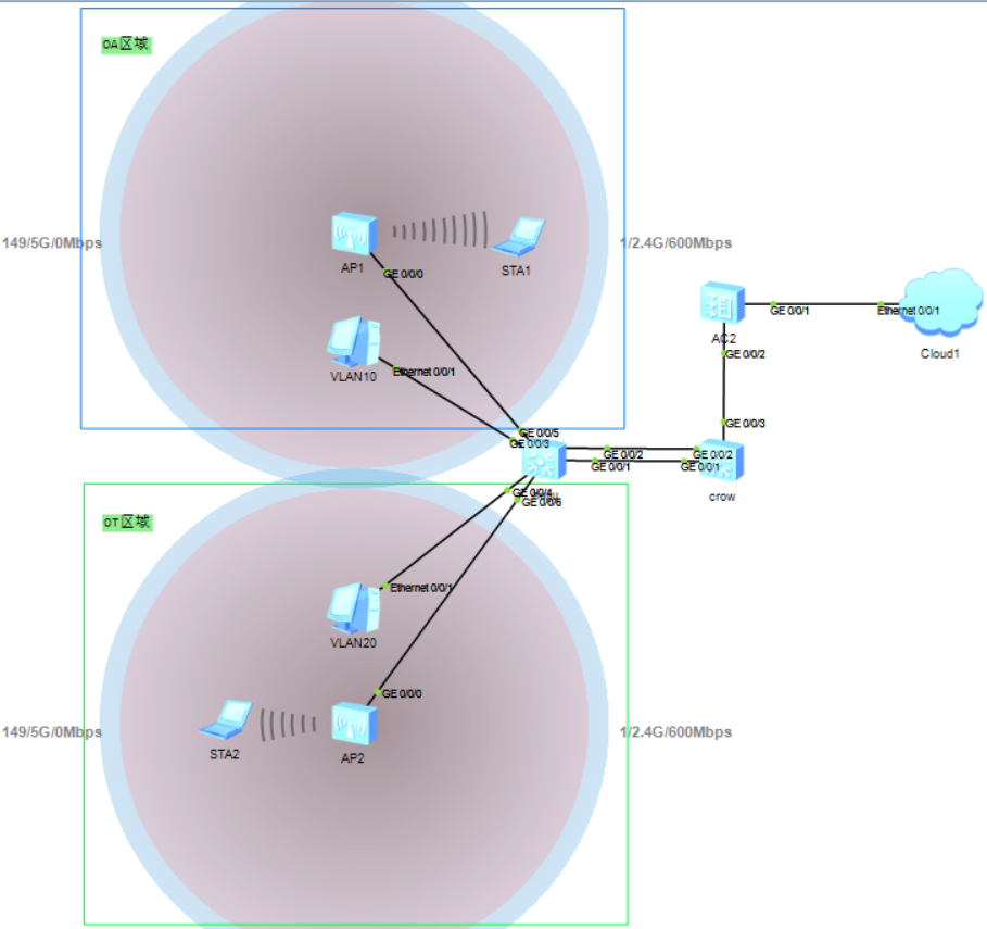 无论是有线还是无线,实现OA和OT逻辑分区,互访采用OSPF。默认所有的无线AP全放到OA的VLAN30统一管理,业务依然按照OA和OT区分