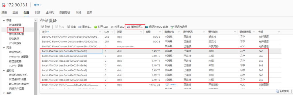 1、磁盘清除分区,每台VSAN主机的每块盘都需要清除,VSAN需要干净的盘