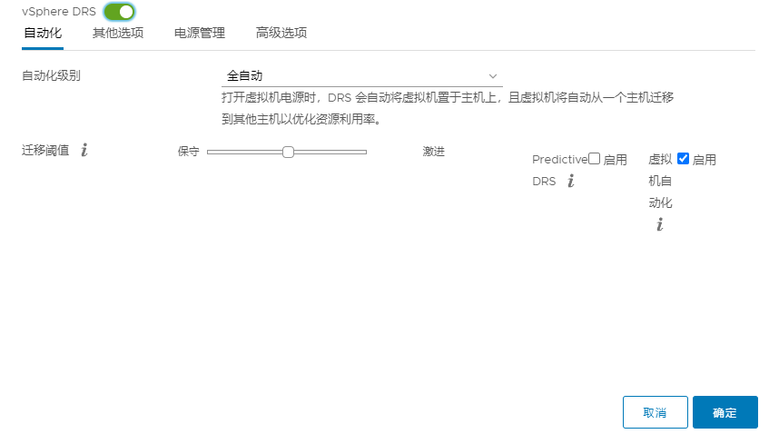 4、配置HA和DRS,DRS不开,无法使用自动迁移调度计划,如果授权只是标准授权,则无法使用DRS和分布式交换机