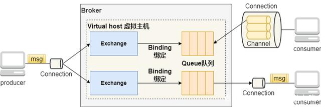 其中,中间的Broker表示RabbitMQ服务,每个Broker里面至少有一个Virtual host虚拟主机,每个虚拟主机中有自己的Exchange交换机、Queue队列以及Exchange交换机与Queue队列之间的绑定关系Binding。producer(生产者)和consumer(消费者)通过与Broker建立Connection来保持连接,然后在Connection的基础上建立若干Channel信道,用来发送与接收消息。