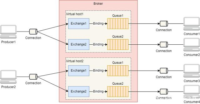 Virtual host是一个虚拟主机的概念,一个Broker中可以有多个Virtual host,每个Virtual host都有一套自己的Exchange和Queue,同一个Virtual host中的Exchange和Queue不能重名,不同的Virtual host中的Exchange和Queue名字可以一样。这样,不同的用户在访问同一个RabbitMQ Broker时,可以创建自己单独的Virtual host,然后在自己的Virtual host中创建Exchange和Queue,很好地做到了不同用户之间相互隔离的效果。
