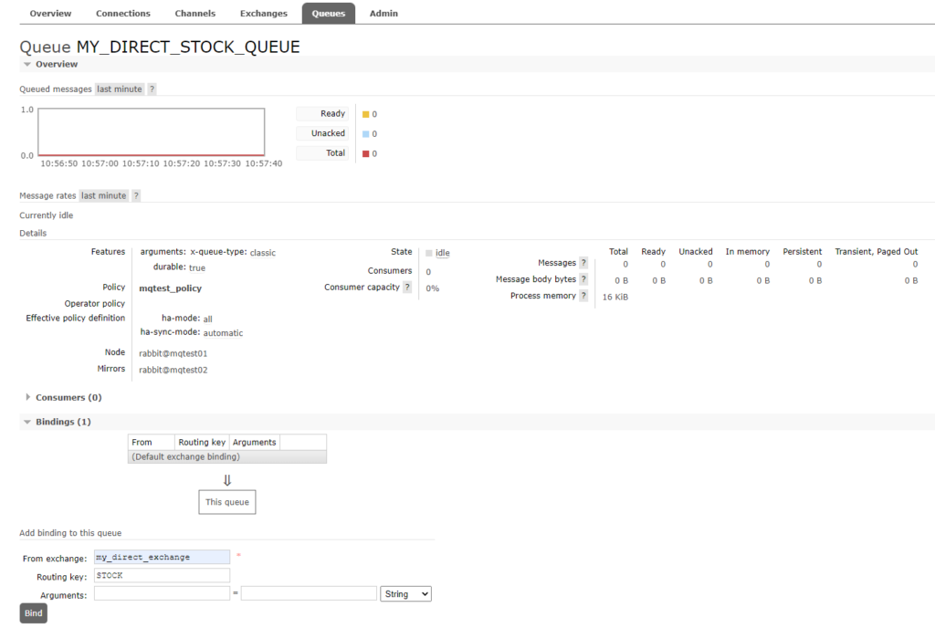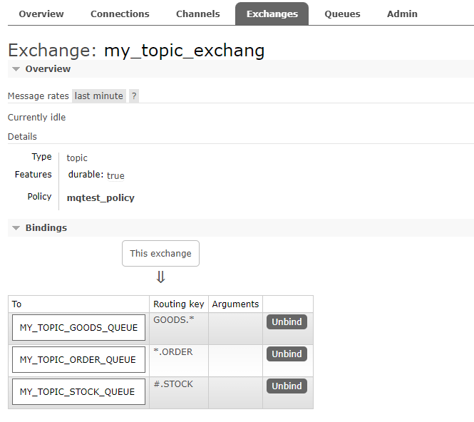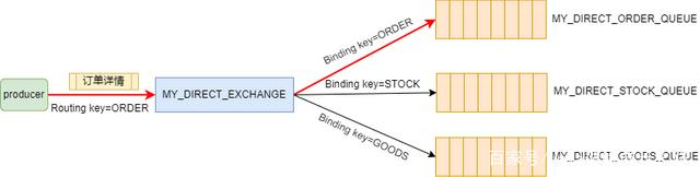 比如我们现在有一个direct类型的Exchange,它下面绑定了三个Queue,Binding key分别是ORDER/GOODS/STOCK: