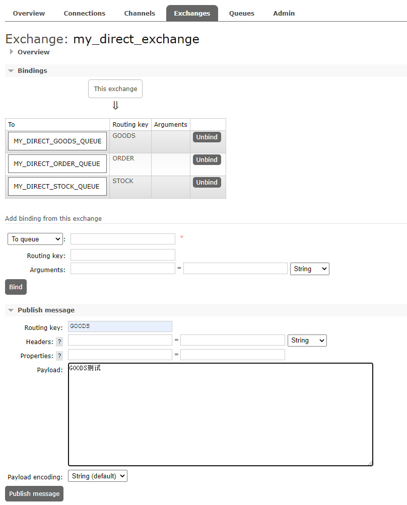 1.4、然后我们向该Exchange中发送一条消息,消息的Routing key是GOODS: