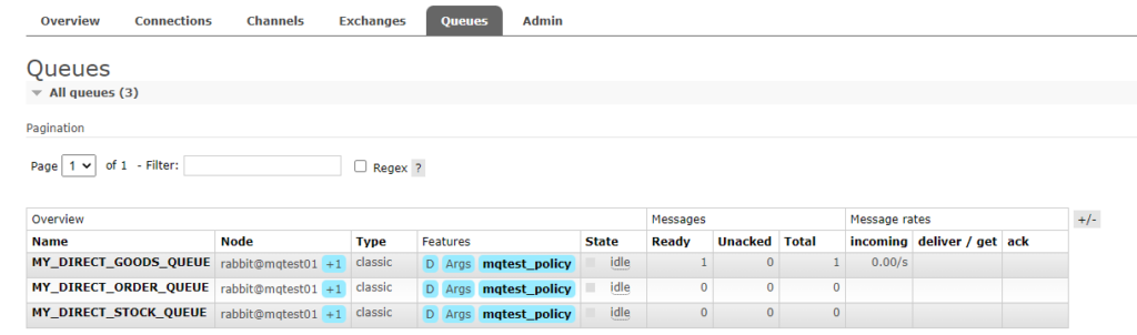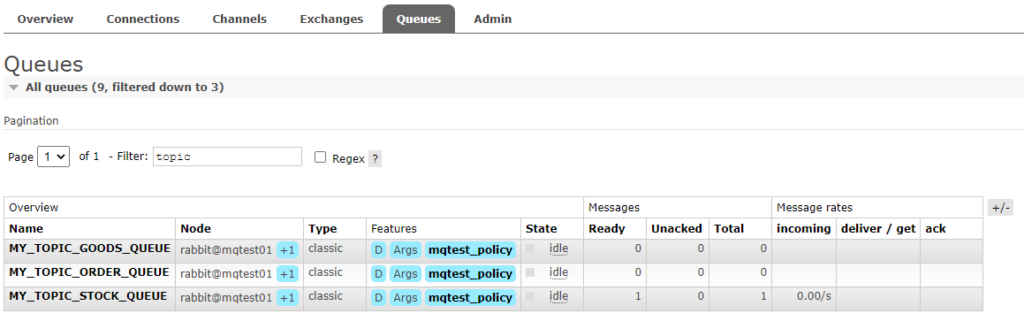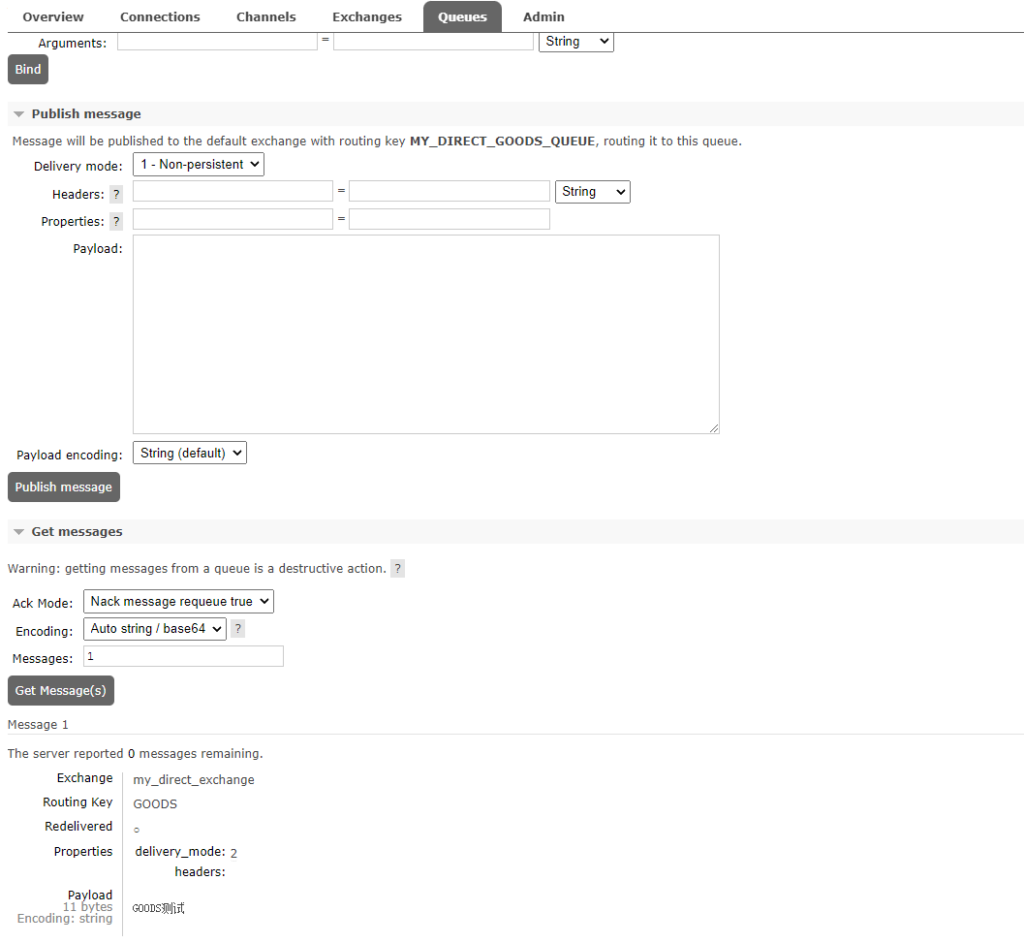 1.5、按照规则分析,这条消息应该被路由到MY_EXCHANGE_GOODS_QUEUE这个Queue。消息发送成功之后,我们去Queues中查看,发现确实只有MY_EXCHANGE_GOODS_QUEUE这个QUEUE接收到了一条消息。
