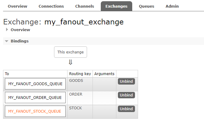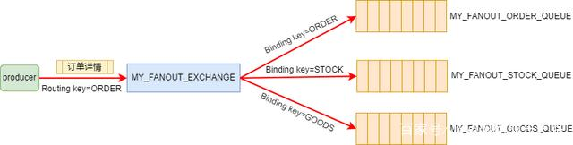比如我们现在有一个fanout类型的Exchange,它下面绑定了三个Queue,Binding key分别是ORDER/GOODS/STOCK: