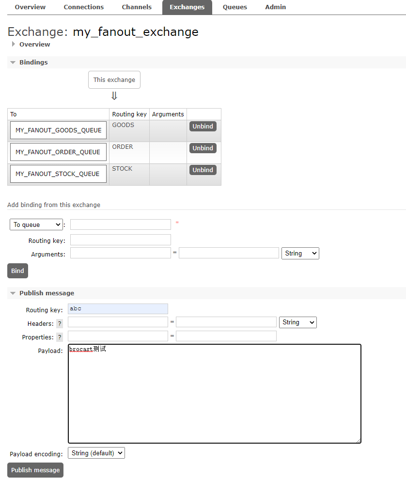 2.2、然后我们向该Exchange中发送一条消息,消息的Routing key随便填一个值abc或不指定: