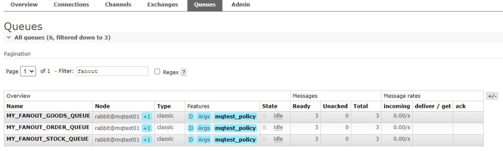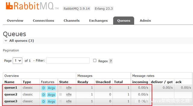 2.3、按照规则分析,这条消息应该被路由到所有与该Exchange绑定的Queue,即三个Queue都应该会受到消息。消息发送成功之后,我们去Queues中查看,发现确实每个QUEUE都接收到消息,我发送了三条。