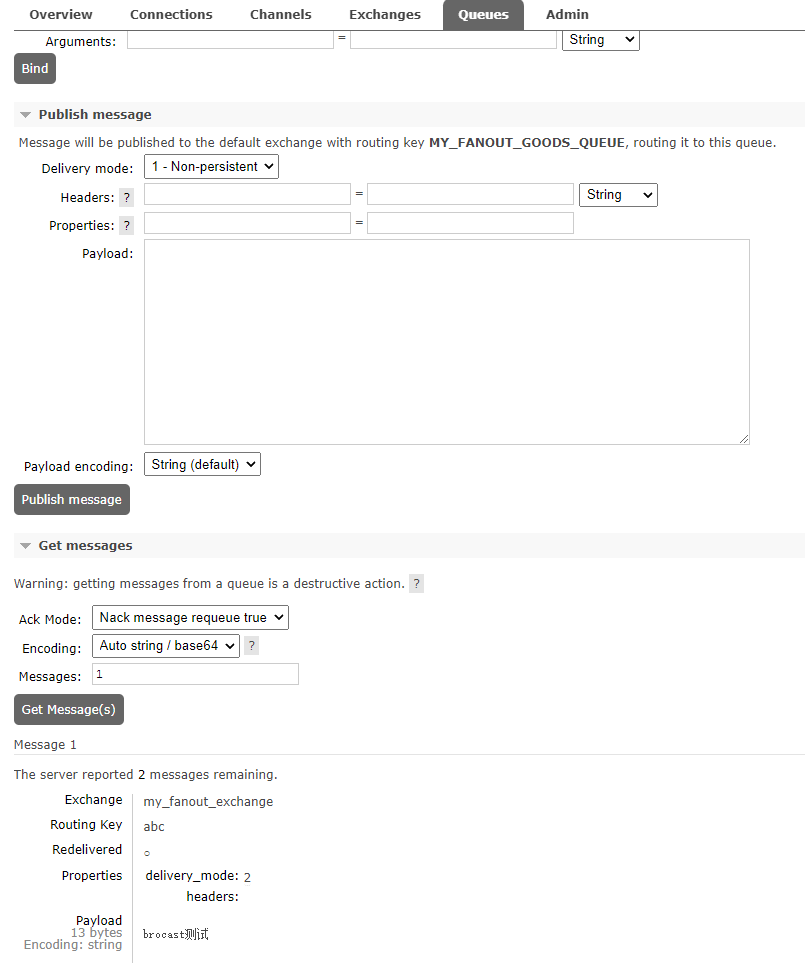 2.4、进入这三个QUEUE,通过getMessage取出消息查看,确实是我们刚才手动发送的那条消息。