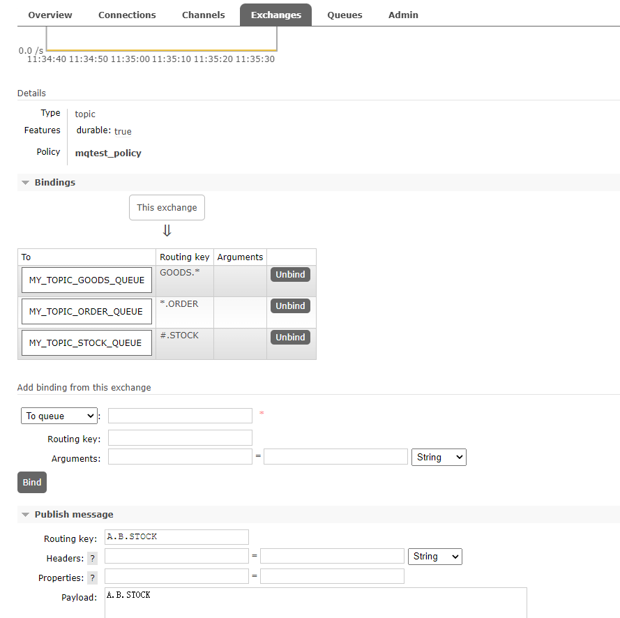 3.2、然后我们向该Exchange中发送一条消息,消息的Routing key为:A.B.STOCK。