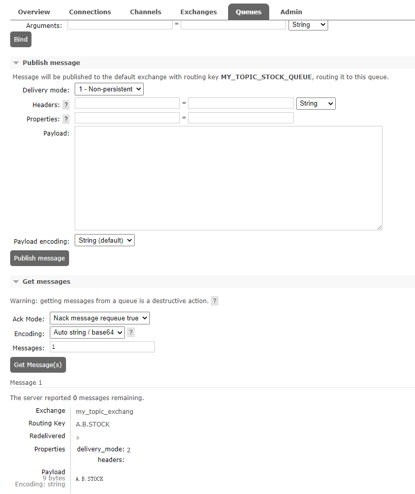 3.3、按照规则分析,A.B.STOCK这个Routing key只可以匹配到 “#.STOCK” ,所以,这条消息应该被路由到MY_TOPIC_STOCK_QUEUE这个Queue中。消息发送成功之后,我们去Queues中查看,发现结果符合我们的预期。