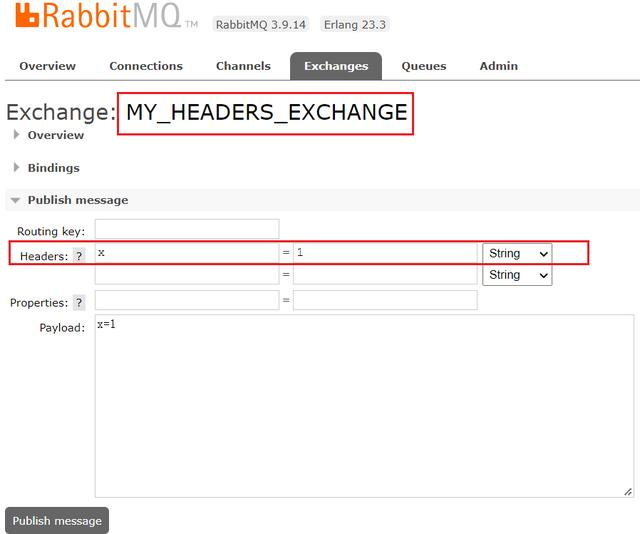 比如我们向上面的Exchange中发送一条消息,消息的Headers中添加“x=1”: