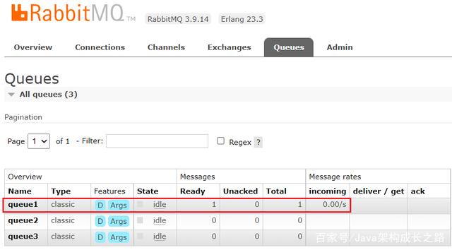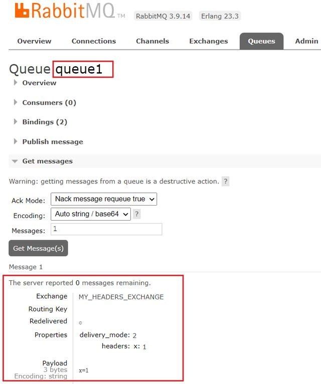 根据规则,只有queue1这个队列满足x=1的条件,queue2中的y=2条件不满足,所以,消息应该只被路由到queue1队列中。消息发送成功后,我们可以看到queue1确实收到了消息: