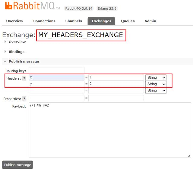 然后我们再发送一条消息,消息的headers中有两个属性:x=1,y=2: