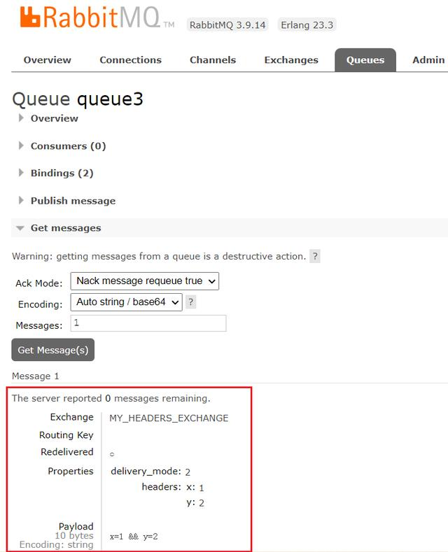 根据规则,queue1的x=1的条件满足,queue2的x=1、y=2的条件满足,queue3的y=2的条件满足,所以,这三个Queue应该都能够收到这条消息。消息发送成功后,结果符合预期: