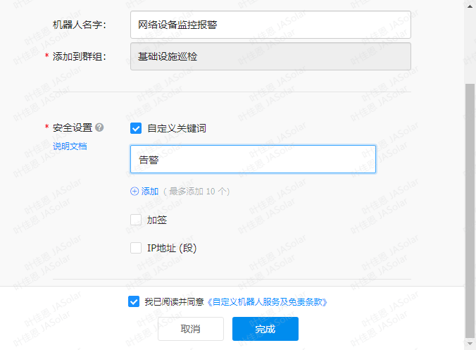 “这是条告警测试信息,请忽略”:这是具体的告警信息,告警信息必须包含“安全设置”中自己设置的“自定义关键词”,否则无法发送告警信息,我这里设置的告警关键字是”告警”。