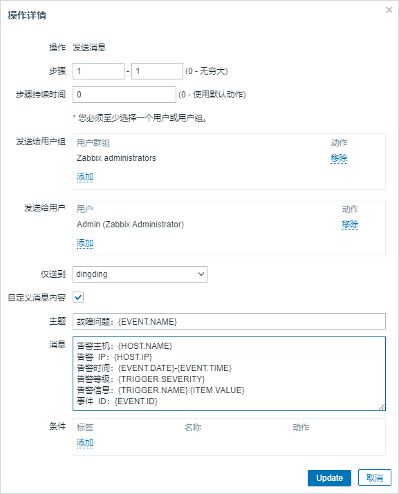 “主题”对应”钉钉告警”媒介中的:{ALERT.SUBJECT}
